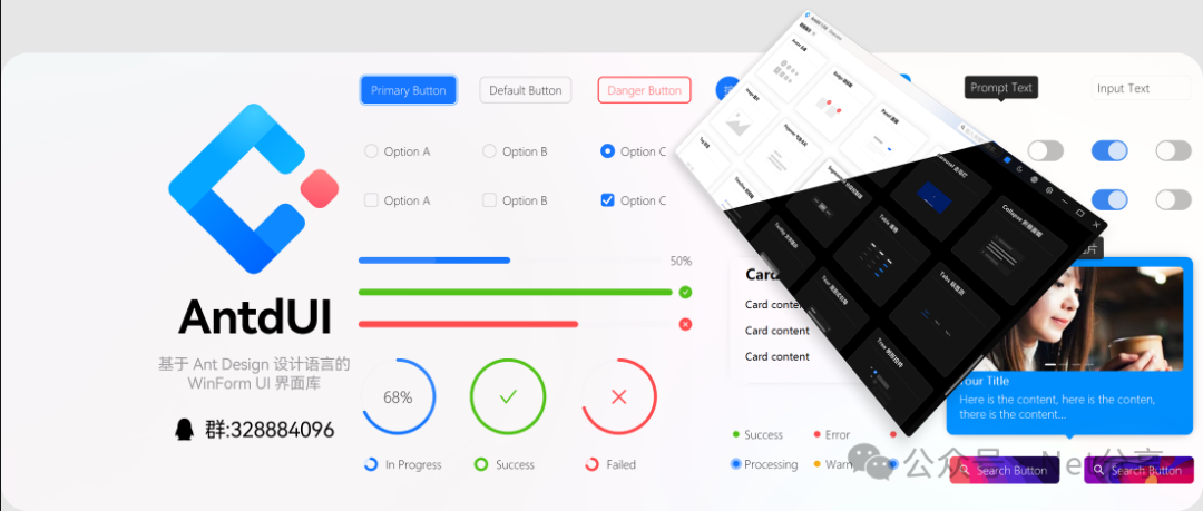 简介AntdUI是一个基于AntDesign设计语言的WinFormUI界面库,致力于将现代美观的前端设计风格引入桌面应用程序开发。采用纯GDI绘图技术,无需任何图片资源,全面支持AOT编译,最低兼容.NETFramework4.0。核心特性•🌈高质量渲染:抗锯齿文字渲染,视觉效果更佳•🎨纯GDI矢量绘图:无依赖图...