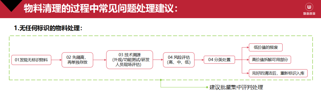 中小企业的仓管人员在对呆滞物料盘点清理过程中,会遇到无任何标识的物料(俗称“黑户物料”)的难题,今天重点谈谈如何该如何处理此类物料。处理此类物料,我们需要建立一套处理流程(机制),能快速对物料进行识别及安全处理,以规避后期的误用及资源的浪费。以下是处理步骤、工具及行业示例:一、标准化处理流程:​二、具体操作步骤及示例:...