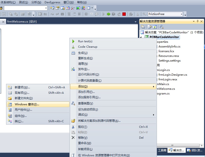 2、将Form1在解决方案资源管理器中重命名为frmWelcome,然后再新建两个窗体,分别命名为frmLogin、frmMain,在起名的时候,我们最好能严格按照控件命名编写规范来命名。
