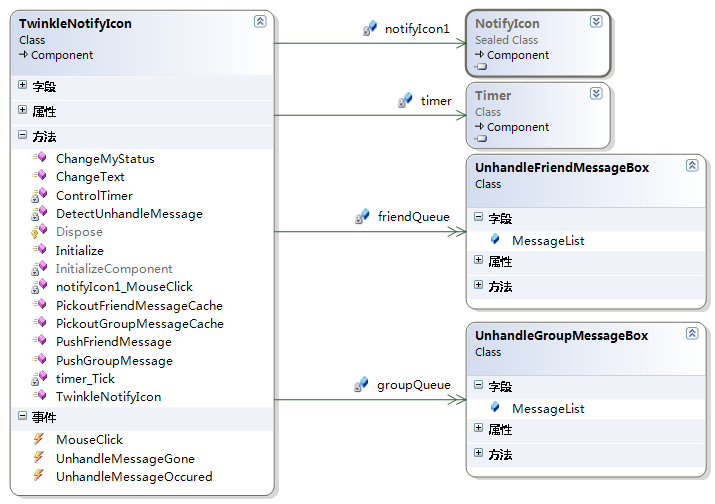 当QQ收到好友的消息时,托盘的图标会变成好友的头像,并闪动起来,点击托盘,就会弹出与好友的聊天框,随即,托盘恢复成QQ的图标,不再闪动。当然,如果还有其它的好友的消息没有提取,托盘的图标会变成另一个好友的图标,并继续闪动。那么,QQ的这一效果是如何实现的了?我在QQ高仿GG2014中实现了同样的效果,这里我就详细地介绍一下。另外,文末最后会奉上GG最新版本4.1的源码,这次甚至包含了JustLib项目的源码哦! 想要直接下载体验的朋友请点击:“下载中心” 一.TwinkleNotifyIcon的实现原理这个会闪动的托盘图标,我将其定义为一个组件TwinkleNotifyIcon,我们先看TwinkleNotifyIcon的类图: 从TwinkleNotifyIcon类图,我们已经可以看出大致的实现方案: (1)TwinkleNotifyIcon 内部使用了NotifyIcon,以显示在右下角的托盘。 (2)使用一个Timer定时器来控制托盘的闪动。 (3)使用一个队列friendQueue来存放待提取的好友消息。 (4)使用另一个队列groupQueue来存放待提取的群消息。 (5)当网络引擎接收到一个好友/群消息时,我们就调用PushFriendMessage/PushGroupMessage方法,将其压入friendQueue/groupQueue,并开始闪动图标。 (6)当托盘被点击时,就从Queue中提取最早的一个消息,并将其交给对应的聊天窗口去处理。 二.TwinkleNotifyIcon 实现要点我们顺着以下的顺序来研究TwinkleNotifyIcon的实现代码,就很容易了: (1)压入好友/群消息。 (2)点击托盘,提取消息。 (3)重新判断Queue中是否还有待提取的消息,以设置托盘的状态。 1. 压入消息我们以PushFriendMessage方法为例,PushGroupMessage的道理是一样的。 public void PushFriendMessage(string userID, int informationType, byte[] info, object tag) { lock (this.locker) { try { this.twinkleNotifySupporter.PlayAudioAsyn(); //播放消息提示音 //首先查看是否已经存在对应的聊天窗口 IChatForm form = this.twinkleNotifySupporter.GetExistedChatForm(userID); if (form != null) { form.HandleReceivedMessage(informationType, info, tag); return; } //接下来准备将消息压入queue UnhandleFriendMessageBox cache = null; lock (this.locker) { //先查看queue中目标好友对应的Cache是否存在 for (int i = 0; i < this.friendQueue.Count; i++) { if (this.friendQueue[i].User == userID) { cache = this.friendQueue[i]; break; } } if (cache == null) //如果不存在,则为好友新建一个Cache { cache = new UnhandleFriendMessageBox(userID); this.friendQueue.Add(cache); //触发UnhandleMessageOccured事件 if (this.UnhandleMessageOccured != null) { this.UnhandleMessageOccured(UnhandleMessageType.Friend, userID); } } cache.MessageList.Add(new Parameter<int, byte[], object>(informationType, info, tag)); } string userName = this.twinkleNotifySupporter.GetFriendName(userID); this.notifyIcon1.Text = string.Format("{0}({1}) {2}条消息", userName, userID, cache.MessageList.Count); //获取好友的头像,将其作为托盘图标 this.twinkleIcon = this.twinkleNotifySupporter.GetHeadIcon(userID); this.ControlTimer(true); //启动闪烁 } catch (Exception ee) { MessageBox.Show(ee.Message); } } } (1)在压入消息的时候,先要播放消息提示音,以通知使用者收到了新的消息。 (2)首先要判断消息的来源好友是否正在和自己聊天(已经打开了与对方的聊天窗口),如果是,则直接将消息交给聊天窗口去显示。否则,进入下一步。 (3)看当前的队列中是否已经存在了目标好友的Cache,因为可能已经有了待提取的来自该好友的消息了。如果已经存在这个Cache,则将消息直接放入Cache,否则,为之新建一个,再放入。 (4)之所以要触发UnhandleMessageOccured事件,是为了通知外面,有待提取的消息出现了。比如,MainForm就会预定这个消息,然后使得好友列表中对应的头像闪动。 void notifyIcon_UnhandleMessageOccured(UnhandleMessageType type, string friendOrGroupID) { if (type == UnhandleMessageType.Friend) { this.friendListBox1.SetTwinkleState(friendOrGroupID, true); this.recentListBox1.SetTwinkleState(friendOrGroupID, false, true); return; } if (type == UnhandleMessageType.Group) { this.groupListBox.SetTwinkleState(friendOrGroupID, true); this.recentListBox1.SetTwinkleState(friendOrGroupID, true, true); return; } } 上面的UnhandleMessageOccured事件处理函数,不仅仅使得好友列表中对应的头像闪动,即使是最近联系人中,如果存在目标好友,也会使其头像闪动。 (5)将托盘图标设置为目标好友的头像,并将ToolTip设置为好友的名称及待提取的消息数量。 (6)使用定时器闪动图标。 2.点击托盘,提取消息如果托盘正在闪动,表明有待提取的消息,此时点击托盘,将提取队列中最早压入的好友的消息。 void notifyIcon1_MouseClick(object sender, MouseEventArgs e) { try { if (e.Button != MouseButtons.Left) { return; } lock (this.locker) { if (this.friendQueue.Count > 0) { UnhandleFriendMessageBox cache = this.friendQueue[0]; this.friendQueue.RemoveAt(0); IChatForm form = this.twinkleNotifySupporter.GetChatForm(cache.User); if (form != null) //如果为null,表示刚删除好友 { form.HandleReceivedMessage(cache.MessageList); } this.DetectUnhandleMessage(); if (this.UnhandleMessageGone != null) { this.UnhandleMessageGone(UnhandleMessageType.Friend, cache.User); } return; } if (this.groupQueue.Count > 0) { UnhandleGroupMessageBox cache = this.groupQueue[0]; this.groupQueue.RemoveAt(0); IGroupChatForm form = this.twinkleNotifySupporter.GetGroupChatForm(cache.Group); form.HandleReceivedMessage(cache.MessageList); this.DetectUnhandleMessage(); if (this.UnhandleMessageGone != null) { this.UnhandleMessageGone(UnhandleMessageType.Group, cache.Group); } return; } } if (this.MouseClick != null) { this.MouseClick(sender, e); } } catch (Exception ee) { MessageBox.Show(ee.Message + " - " + ee.StackTrace); } } (1)从上面代码执