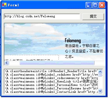 原文见:http://blog.csdn.net/Felomeng/archive/2007/05/18/1614411.aspx 摘要: 这个小示例展示了如何使用微软网页浏览器以及微软 文档对象模型(DOM)去处理任意网页中的元素。 为了在编程中使用DOM,需要把网页浏览器和与它的方法、属性、事件相关的DOM添加到你的C#工程中。通过调用Navigate方法打开Url地址指向的文档。打开网页需要一定时间,所以必须等待打开事件完成。通过IHTMLDocument2界面对象将浏览器文档格式化从而得到常见的网页形式。可以对集合进行相应的操作,如点击一个链接或图片集合,就会返回一个IHTMLElementCollection对象。 在这个小示例中,您将用网页浏览器和DOM来得到和显示一个网页中的所有内容。 在编程中访问 DOM