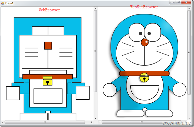 WebKit.NET是对WebKit的.Net封装,使用它.net程序可以非常方便的集成和使用webkit作为加载网页的容器。这里介绍一下怎么用它来显示一个网页这样的一个最简单的功能。 第一步:下载WebKit.Net 的bin文件.WebKit.net 的主页是http://webkitdotnet.sourceforge.net/ 直接下载0.5版本的windows bin文件地址为:https://sourceforge.net/projects/webkitdotnet/files/WebKit%20.NET%200.x/0.5/WebKit.NET-0.5-bin-cairo.zip/download 第二步:新建一个WindowsForms工程。 然后把下载好的webkit.net bin目录下的所有文件复制到新建工程的bin/Debug/目录下。 添加引用,通过浏览添加对“WebKitBrowser.dll”的引用。 第三步:来写写代码了。双击Form1的窗体进入代码,写下这几行代码: private void Form1_Load(object sender, EventArgs e) { WebKit.WebKitBrowser browser = new WebKitBrowser(); browser.Dock = DockStyle.Fill; this.Controls.Add(browser); browser.Navigate("http://www.lixin.me"); } 运行看看效果: 与IE内核的WebBrowser对比:非常简单的三步就完成了。可是话说回来了,时下都流行一步到位的,例如使用System.Windows.Forms.WebBrowser 。 使用.Net框架自带的,调用IE内核的WebBrowser来显示网页也许更简单些,只需要在新建的工程中写下这么几行代码便可: private void Form1_Load(object sender, EventArgs e) { WebBrowser browser = new WebBrowser(); browser.Dock = DockStyle.Fill; this.Controls.Add(browser); browser.Navigate("http://www.lixin.me"); } 运行起来的效果看起来差不多,肉眼基本只能看出字体稍微不同而已: 既然都差不多,那为什么还不厌其烦的去下载几个M的dll来显示网页呢?这是因为如果使用IE内核的WebBrowser我们无法预知对网页的显示效果,例如你的电脑是xp,可能会调用ie6作为加载器,如果是win7,可能会调用ie8作为加载器,而他们的显示效果是不完全一样的。下面用一个例子来看看。 http://css3.zxq.net/doraemon/doraemon_css3.html 这个页面是用来测试浏览器对CSS3的支持程度的。现在我们分别用2个方法来显示这个页面。 private void Form1_Load(object sender, EventArgs e) { WebBrowser browser = new WebBrowser(); browser.Dock = DockStyle.Fill; browser.Navigate("http://css3.zxq.net/doraemon/doraemon_css3.html"); splitContainer1.Panel1.Controls.Add(browser); WebKit.WebKitBrowser kitBrowser = new WebKitBrowser(); kitBrowser.Dock = DockStyle.Fill; kitBrowser.Navigate("http://css3.zxq.net/doraemon/doraemon_css3.html"); splitContainer1.Panel2.Controls.Add(kitBrowser); } 效果图如下: 本机的系统是win7+IE9,但是通过WebBrowser调用,估计仍然使用的是IE8内核,所以显示效果很差。 通过这样左右对比,可以看出多了一步麻烦,是有必要的。 该文章在 2017/2/17 12:30:28 编辑过 |