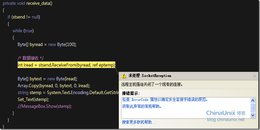 如下图,一Catch到这类System.Net.Sockets.SocketException异常(当然这里把它设为Exceptioin异常,抓取的范围更广),那么就用MessageBox给用户一个提示,然后从该分支退出就行了。