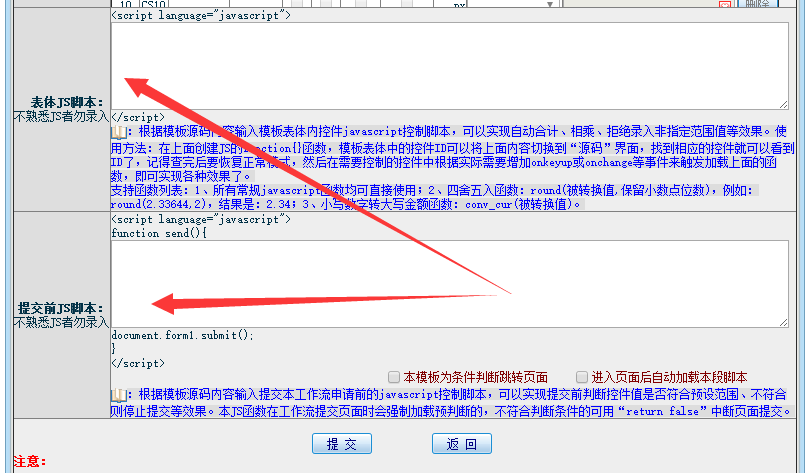 也可以用以下方法,注意工作流模板设计时下面有一个启用Javascript脚本的高级模式,可以在提交前输入JS脚本,利用JS判断需要必填的字段为空,就禁止提交即可。