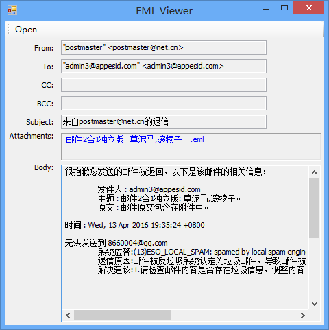 MessageBox.Show(this, "An error occured while opening the file", "Email could not be opened",