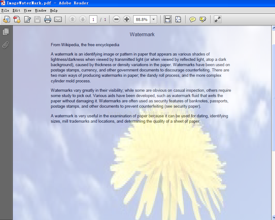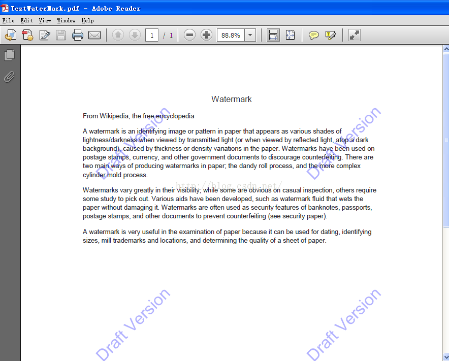 下面就列举一些怎样给PDF文件添加图片水印和文本水印的代码片段。我把它分为两部分。一部分是图片水印,另一部分是文本水印。