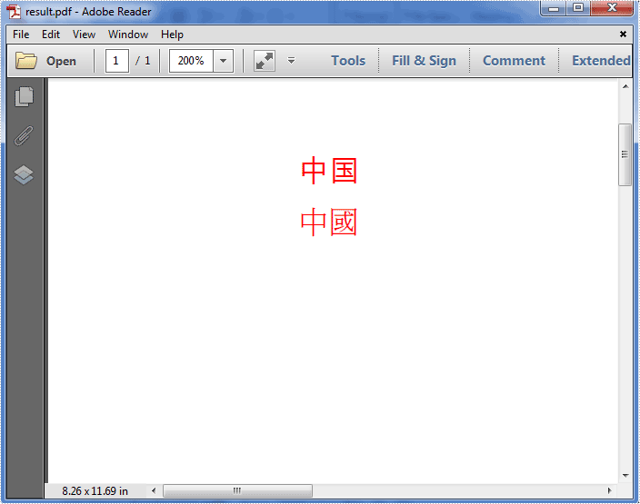 page.Canvas.DrawString("中國", font1, PdfBrushes.Red, 50, 70);