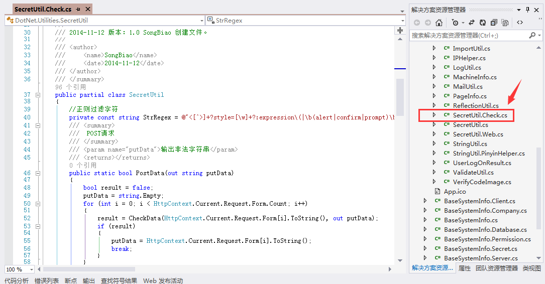 每一个开发者都会意识到,网站发布之前,需要进行安全检查。 那么如何拦截攻击者注入恶意代码?如何防御诸如跨站脚本攻击(XSS)、SQL注入攻击等恶意攻击行为? 针对目前常见的一些安全问题,结合目前一些常见的防护办法,通用权限管理系统底层增加了安全防护代码, 现将源码提供如下 namespace DotNet.Utilities { /// <summary> /// 网站安全通用防护 /// /// 主要功能: /// 拦截攻击者注入恶意代码,可以防御诸如跨站脚本攻击(XSS)、SQL注入攻击等恶意攻击行为。 /// /// 修改纪录 /// /// 2013-12-27,更新正则表达式避免误报问题。 /// 2013-01-08,更新了aspx防护脚本中referer变量冲突问题。 /// 2013-01-09,加入了UTF7编码XSS的防护。 /// 2013-01-28,增强了对XSS的防护。 /// 2013-01-31,针对某些用户后台上传文件出错的问题。 /// 2013-03-15,增强了对POST的防护。 /// 2013-03-28,增强了对XSS的防护。 /// 2013-04-25,对XSS防护加入了通用的防护方法。 /// 2013-08-02,加入对XSS编码绕过的防护。 /// 2013-08-14,增强利用样式的XSS防护。 /// 2014-11-12,解决SQL盲注不拦截的问题。 /// /// 2014-11-12 版本:1.0 SongBiao 创建文件。 /// /// <author> /// <name>SongBiao</name> /// <date>2014-11-12</date> /// </author> /// </summary> public partial class SecretUtil { //正则过滤字符 private const string StrRegex = @"<[^>]+?style=[\w]+?:expression\(|\b(alert|confirm|prompt)\b|^\+/v(8|9)|<[^>]*?=[^>]*?&#[^>]*?>|\b(and|or)\b.{1,6}?(=|>|<|\bin\b|\blike\b)|/\*.+?\*/|<\s*script\b|<\s*img\b|\bEXEC\b|UNION.+?SELECT|UPDATE.+?SET|INSERT\s+INTO.+?VALUES|(SELECT|DELETE).+?FROM|(CREATE|ALTER|DROP|TRUNCATE)\s+(TABLE|DATABASE)"; /// <summary> /// POST请求 /// </summary> /// <param name="putData">输出非法字符串</param> /// <returns></returns> public static bool PostData(out string putData) { bool result = false; putData = string.Empty; for (int i = 0; i < HttpContext.Current.Request.Form.Count; i++) { result = CheckData(HttpContext.Current.Request.Form[i].ToString(), out putData); if (result) { putData = HttpContext.Current.Request.Form[i].ToString(); break; } } return result; } /// <summary> /// GET请求 /// </summary> /// <param name="putData">输出非法字符串</param> /// <returns></returns> public static bool GetData(out string putData) { bool result = false; putData = string.Empty; for (int i = 0; i < HttpContext.Current.Request.QueryString.Count; i++) { result = CheckData(HttpContext.Current.Request.QueryString[i].ToString(), out putData); if (result) { putData = HttpContext.Current.Request.QueryString[i].ToString(); break; } } return result; } /// <summary> /// COOKIE /// </summary> /// <param name="putData">输出非法字符串</param> /// <returns></returns> public static bool CookieData(out string putData) { bool result = false; putData = string.Empty; for (int i = 0; i < HttpContext.Current.Request.Cookies.Count; i++) { result = CheckData(HttpContext.Current.Request.Cookies[i].Value.ToLower(), out putData); if (result) { putData = HttpContext.Current.Request.Cookies[i].Value.ToLower(); break; } } return result; } /// <summary> /// UrlReferrer请求来源 /// </summary> /// <param name="putData">输出非法字符串</param> /// <returns></returns> public static bool Referer(out string putData) { bool result = false; result = CheckData(HttpContext.Current.Request.UrlReferrer.ToString(), out putData); if (result) { putData = HttpContext.Current.Request.UrlReferrer.ToString(); } return result; } /// <summary> /// 正则检查 /// </summary> /// <param name="inputData">字符串</param> /// <param name="putData">输出非法字符串</param> /// <returns></returns> public static bool CheckData(string inputData, out string putData) { putData = string.Empty; //if (Regex.IsMatch(inputData.ToUpper(), StrRegex.ToUpper(),RegexOptions.IgnoreCase)) if (Regex.IsMatch(inputData, StrRegex, RegexOptions.IgnoreCase)) { putData = inputData; return true; } else { return false; } } } } 源码在通用权限底层中的位置: ![]() 调用方法:(ASP.NET MVC参考)在Global.asax文件中增加以下方法 /// <summary> /// 在此处进行安全检测和防范 /// Application_BeginRequest /// </summary> /// <param name="sender"></param> /// <param name="e"></param> protected void Application_AcquireRequestState(object sender, EventArgs e) { HttpContext context = HttpContext.Current; string putData = string.Empty; if (Request.Cookies != null) { if (SecretUtil.CookieData(out putData)) { ResponseWarnMessage(context, "Cookie数据有恶意字符!", putData); } } if (Request.UrlReferrer != null) { if (SecretUtil.Referer(out putData)) { ResponseWarnMessage(context, "Referrer数据有恶意字符!", putData); } } if (Request.RequestType.ToUpper() == "POST") { if (SecretUtil.PostData(out putData)) { ResponseWarnMessage(context, "Post数据有恶意字符!", putData); } } if (Request.RequestType.ToUpper() == "GET") { if (SecretUtil.GetData(out putData)) { ResponseWarnMessage(context, "Get数据有恶意字符!", putData); } } } /// <summary> /// 非安全行为 输出警告信息 /// </summary> /// <param name="errorMessage"></param> /// <param name="putData"></param> private void ResponseWarnMessage(HttpContext context, string errorMessage, string putData) { //记录一下恶意攻击行为 string ipAddress = Utilities.GetIPAddress(true); BaseUserInfo userInfo = context.Session[DotNet.Business.Utilities.SessionName] as BaseUserInfo; //非安全行为同时记录到数据库和文本文件中 LogHelper.OracleWarn(userInfo, "恶意访问行为", "来自IP:" + ipAddress + "的访问存在恶意行为:" + errorMessage + "字符内容:" + putData, " private void ResponseErrorMessage(string errorMessage, string putData)", typeof(MvcApplication), null); RouteData routeData = new RouteData(); routeData.Values.Add("controller", "Error"); routeData.Values.Add("action", "General"); routeData.Values.Add("ti