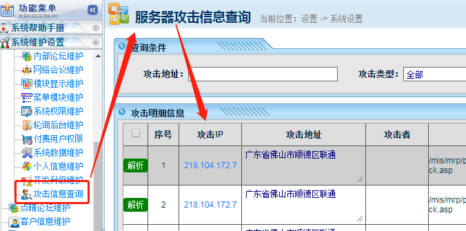 点晴OA-》设置-》系统维护设置-》攻击信息查询: