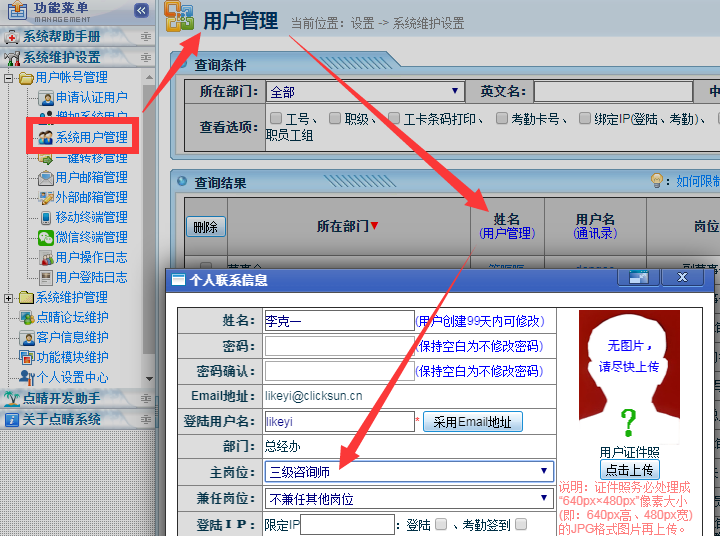 在系统设置-》系统维护设置-》用户账户管理-》系统用户管理中,找到这个用户,点击打开,就可以调整用户信息了,注意,部门和职级不允许直接调整,需要通过调整岗位的方式来调整所在部门,点晴OA中岗位是绑定了部门和职级的,部门或职级的异动一定会导致岗位的变化,如果岗位和部门/职级的关系发生变化,那么必须先调整岗位所在部门和职级: