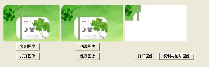 //粘贴图像 private void button5_Click(object sender, EventArgs e) { IDataObject iData = Clipboard.GetDataObject(); if (iData.GetDataPresent(DataFormats.Bitmap)) { pictureBox4.Image = (Bitmap)iData.GetData(DataFormats.Bitmap); } }