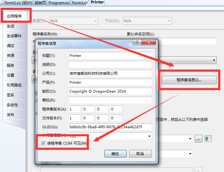 4.在应用程序选项卡中点击程序集信息,然后勾选“使程序集COM可见”。