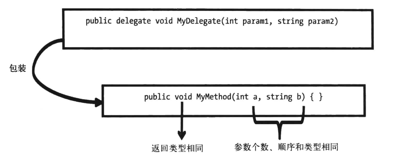 委托能包装的方法是有一定限制的,例如能被前面的委托类型MyDelegate包装的方法需要满足以下条件: 1.方法的返回类型必须为void; 2.方法必须有两个参数,并且第一个参数应为int类型,第二个参数为string类型。 总结:可以被委托包装的方法必须满足以下规则: 1.方法的签名必须与委托一致,方法签名包括参数的个数、类型和顺序; 2.方法的返回类型要和委托一致,注意,方法的返回类型不属于方法签名的一部分。 该文章在 2021/1/29 8:57:26 编辑过 |