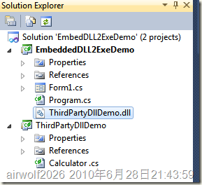 (图1:示例项目,ThirdPartydlldemo.dll作为第三方资源,Build Action属性设置为" Embedded Resource")然后在Program.cs里面声明个静态构造函数,在该方法里面把第三方dll输出到程序目录,这样在调用第三方dll方法的时候,相关环境已经初始化完毕了。