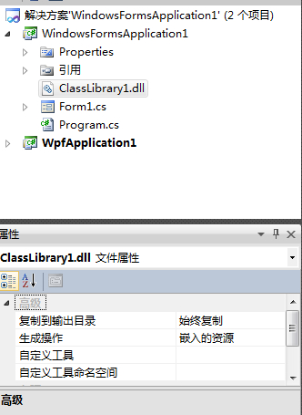 2.把ClassLibrary1复制到项目中,右键dll,选择生成方式为:嵌入的资源