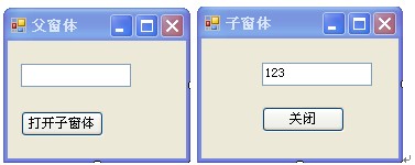 如图有父窗体和子窗体两个窗体,现在我想实现当点击父窗体中按钮时弹出子窗体(当然这个超级简单),在弹出子窗体后,在子窗体的文本框中输入内容,点击关闭按钮后子窗体关闭,并且将子窗体中输入的内容在父窗体的文本框中显示。