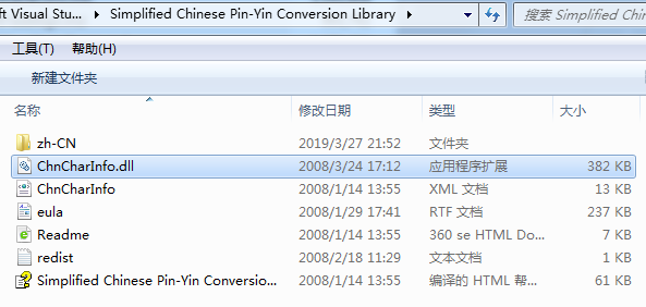 二、安装使用1)打开下载地址,解压安装 CHSPinYinConv.msi 2)打开默认安装目录:C:\Program Files (x86)\Microsoft Visual Studio International Pack\Simplified Chinese Pin-Yin Conversion Library\ 3)在项目中,添加引用,ChnCharInfo.dll 三、源码 1 public static class PinYinHelper