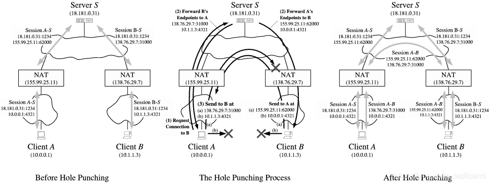 - Client有可能分到多个公网地址,例如:在NAT将公网地址155.99.25.11:62000分配给client A与S的会话之后,NAT可能会将另一个公网地址(如155.99.25.11:62001)分配给A试图发起与B的P2P会话。在这种情况下,依据提供的连接打洞过程将失败,因为后续来自B的传入消息到达NAT A的错误端口号。