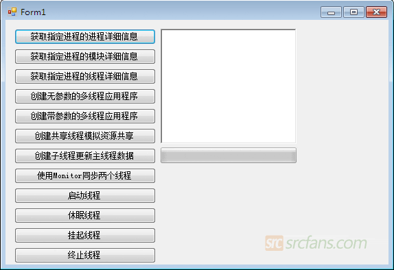 C# 多线程操作实例,获取指定进程的进程详细信息、获取指定进程的模块详细信息、创建无参数的多线程应用程序、创建带参数的多线程应用程序、创建共享线程模拟资源共享、创建子线程更新主线程数据等,部分代码分享如下: if (MyThread.ThreadState == ThreadState.Terminated) MyData += "\n当前状态:已完成执行并已退出"; if (MyThread.ThreadState == ThreadState.Transition) MyData += "\n当前状态:在可以执行前等待处理器之外的资源"; if (MyThread.ThreadState == ThreadState.Unknown) MyData += "\n当前状态:状态未知"; if (MyThread.ThreadState == ThreadState.Wait) MyData += "\n当前状态:正在等待外围操作完成或等待资源释放"; if (MyThread.WaitReason == ThreadWaitReason.EventPairHigh) MyData += "\n等待原因:线程正在等待事件对高"; if (MyThread.WaitReason == ThreadWaitReason.EventPairLow) MyData += "\n等待原因:线程正在等待事件对低"; if (MyThread.WaitReason == ThreadWaitReason.ExecutionDelay) MyData += "\n等待原因:线程执行延迟"; if (MyThread.WaitReason == ThreadWaitReason.Executive) MyData += "\n等待原因:线程正在等待计划程序"; if (MyThread.WaitReason == ThreadWaitReason.FreePage) MyData += "\n等待原因:线程正在等待可用的虚拟内存页"; if (MyThread.WaitReason == ThreadWaitReason.LpcReceive) MyData += "\n等待原因:线程正在等待本地过程调用到达"; if (MyThread.WaitReason == ThreadWaitReason.LpcReply) MyData += "\n等待原因:线程正在等待对本地过程调用的回复到达"; if (MyThread.WaitReason == ThreadWaitReason.PageIn) MyData += "\n等待原因:线程正在等待虚拟内存页到达内存"; if (MyThread.WaitReason == ThreadWaitReason.PageOut) MyData += "\n等待原因:线程正在等待虚拟内存页写入磁盘"; if (MyThread.WaitReason == ThreadWaitReason.Suspended) MyData += "\n等待原因:线程执行暂停"; if (MyThread.WaitReason == ThreadWaitReason.SystemAllocation) MyData += "\n等待原因:线程正在等待系统分配"; if (MyThread.WaitReason == ThreadWaitReason.Unknown) MyData += "\n等待原因:线程正在因未知原因而等待"; if (MyThread.WaitReason == ThreadWaitReason.UserRequest) MyData += "\n等待原因:线程正在等待用户请求"; if (MyThread.WaitReason == ThreadWaitReason.VirtualMemory) MyData += "\n等待原因:线程正在等待系统分配虚拟内存"; 附件:threadcs.rar