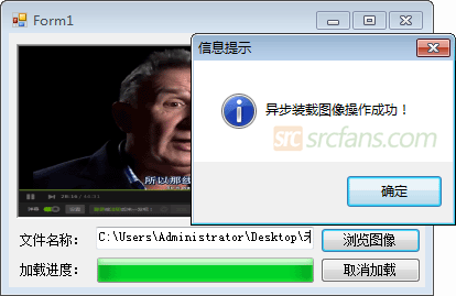 运行本示例exe后,选择一张图片,则会异步加载这张图像,并显示当前图像文件加载进度,如效果图所示。 private void button1_Click(object sender, EventArgs e) {//浏览图像 var MyDlg = new OpenFileDialog(); MyDlg.Filter = "图像文件(JPeg, Gif, Bmp, etc.)│*.jpg;*.jpeg;*.gif;*.bmp;*.tif; *.tiff; *.png│ JPeg图像文件(*.jpg;*.jpeg)│ *.jpg;*.jpeg │GIF图像文件(*.gif)│*.gif │BMP图像文件(*.bmp)│*.bmp│Tiff图像文件(*.tif;*.tiff)│*.tif;*.tiff│Png图像文件(*.png)│ *.png │所有文件(*.*)│*.*"; MyDlg.CheckFileExists = true; if (MyDlg.ShowDialog() == DialogResult.OK) { var MyFile = MyDlg.FileName; this.textBox1.Text = MyFile; this.pictureBox1.LoadAsync(MyFile); } } private void button2_Click(object sender, EventArgs e) {//取消加载 this.pictureBox1.CancelAsync(); } private void pictureBox1_LoadProgressChanged(object sender, ProgressChangedEventArgs e) {//显示当前图像文件加载进度 this.progressBar1.Value = e.ProgressPercentage; } private void pictureBox1_LoadCompleted(object sender, AsyncCompletedEventArgs e) {//显示图像文件加载结果 if (e.Error != null) MessageBox.Show(e.Error.Message, "信息提示", MessageBoxButtons.OK, MessageBoxIcon.Information); else if (e.Cancelled == true) MessageBox.Show("异步装载图像操作被取消!", "信息提示", MessageBoxButtons.OK, MessageBoxIcon.Information); else MessageBox.Show("异步装载图像操作成功!", "信息提示", MessageBoxButtons.OK, MessageBoxIcon.Information); }