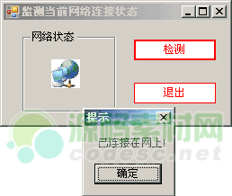 C#检测是否可以上网-网络连接状态,点击检测按钮即可检测是否连接到网络,将检测结果以弹出框的形式告之。经测试,检测结果准确。