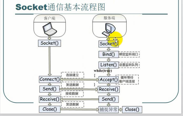 注意:此图是Socket通信的精华,在使用Socket通信时,有什么迷惑的可以看看此图,下面我们讲解的时候也是参照此图