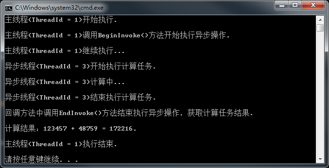 Console.WriteLine("回调方法中调用EndInvoke()方法结束执行异步操作,获取计算任务结果.\n",Thread.CurrentThread.ManagedThreadId);