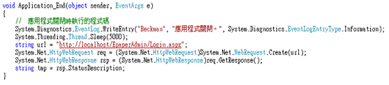 IScheduler sched; private void Application_Start( object sender, EventArgs e) { ISchedulerFactory sf = new StdSchedulerFactory(); IScheduler sched = sf.GetScheduler(); IJobDetail job = JobBuilder.Create<TimingTask>().WithIdentity( "sport_quan_job" , "sport_quan_group" ).Build(); ITrigger trigger = TriggerBuilder.Create().WithIdentity( "sport_quan_job" , "sport_quan_group" ).WithCronSchedule(PubConfig.CronExpr).Build(); sched.ScheduleJob(job, trigger); sched.Start(); LogHelper.WriteLog( "Application_Start" , "Application_Start" ); } private void Application_End( object sender, EventArgs e) { LogHelper.WriteLog( "Application_End" , "Application_End" ); // 在应用程序关闭时运行的代码 if (sched != null ) { sched.Shutdown( true ); } } TimingTask.cs 实现接口IJob: public void Execute(IJobExecutionContext context) { try { if (System.DateTime.Now.Hour == 1) { DataSet dsArrange = new stadium_arrange().SelectArrangeList(); long result = ArrangeHelper.InsertScheduleOfField(dsArrange); if (result > 0) { LogHelper.WriteLog( "更新排班" , "定时更新排班成功!" ); } else { LogHelper.WriteLog( "更新排班" , "暂无更新!" ); } } else { LogHelper.WriteLog( "定时任务" , "仅执行定时任务,不作更新排班操作!" ); } } catch (Exception ex) { LogHelper.WriteLog( "程序异常" , ex.Message); JobExecutionException e2 = new JobExecutionException(ex); // this job will refire immediately e2.RefireImmediately = true ; throw e2; } } web.config 配置: