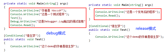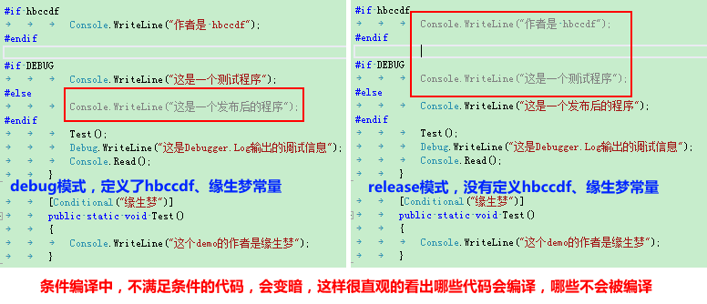 我们可以在条件编译的输入框中,定义自己的编译常量,多个常量之间用分号“;”隔开,而且支持中文常量,如下: 当然,我们也可以在代码中通过#define预处理来定义,比如: #define 缘生梦#define hbccdf 但是有一点需要注意,define定义常量必须在using 命名空间之前,否则会造成编译错误。 通过VS和Resharper改变颜色来查看哪些代码真正会被编译引入条件编译后,我们可以通过VS很快知道哪些代码会被编译: 虽然条件编译的代码可以很直观的看出来,但是Conditional修饰的方法就看不出来了,这时就要借助神器Resharper了,如下图: 从图中看出,release模式,由于没有定义DEBUG、缘生梦两个常量,所以,调用Test、Debug.WriteLine方法的地方就会变暗,这样很直观就知道这些代码不会被编译。再次说明一个道理,神器对于开发有很大的帮助作用。 通过反编译查看生成后的代码上面总是说,有些代码会被编译,有的则不会,那么真正编译后的效果是怎样的,我们不妨使用另外一个比较强大的工具,反编译工具Reflector,来查看一下反编译后的代码: 从图中的反编译后的代码可以看出,满足条件的代码会真正编译到生成的程序集里,而不满足的代码则不会生成到程序集里。 Conditional修饰的方法,会有方法的实现,但是没有方法的调用。不适合在方法里做一些变量的修改。 总结Conditional和条件编译