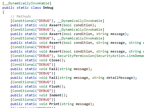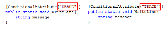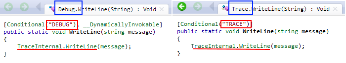TRACE常量从上面多幅图中,可以看到,在Debug和Release模式下都会定义一个TRACE常量。 现在我们知道DEBUG常量是用来控制调用Debug.WriteLine的语句是否被编译。那么TRACE常量呢。 相信很多人也用过System.Diagnostics.Trace类,由DEBUG常量与Debug有关,可以想到TRACE常量与Trace有关,我们来看一下MSDN对于Trace的定义。 从MSDN中,看到Trace类的定义以及可以调用的方法与Debug类似,都有WriteLine方法。下面是Trace的WriteLine方法定义: [ConditionalAttribute("TRACE")]public static void WriteLine(string message 由此可以知道,TRACE常量是用来控制Trace类中WriteLine等方法是否被编译的作用。 Debug类与Trace类的区别到现在为止,我们渐渐的了解了Debug类与Trace类,他们都可以通过WriteLine方法输出调试或跟踪信息,从他们的定义和暴露的方法中,可以看出他们非常相似,那么他们有什么区别呢。 有些人会根据使用的效果总结为:Debug类只能在Debug模式下执行,在Release模式下无效果,而Trace类在Debug和Release模式下都可以执行。 确实,在VS中新建一个项目,分别调用Debug.WriteLine和Trace.WriteLine方法,只有Trace.WriteLine输出的信息,在Release模式下有效。这也看似验证了上面的区别。 但这是他们两个真正的区别吗。我们一点一点来分析。 首先看这两个方法的定义: 由图看到,每个方法都通过ConditionalAttribute关联了一个条件编译常量,Debug关联DEBUG常量,Trace关联TRACE常量。再来看一下这两个常量的定义: 从图中看到,TRACE在Debug和Release模式下都会定义,这样在Debug和Release模式下都会执行,而DEBUG只在Debug模式下才会定义,Debug.WriteLine只在Debug模式下执行。从而也验证了上面的结论。 但DEBUG与TRACE只是在默认的情况下的定义。当改变这些定义后,上面的结论就不再正确。 我们来做这样的实验:Debug模式下只定义TRACE常量,Release模式只定义DEBUG常量 然后在Debug和Release模式下分别执行Debug.WriteLine方法和Trace.WriteLine方法,Debug.WriteLine方法只在Release模式下有效,而Trace.WriteLine方法只在Debug模式下有效。上面的结论不再成立。 为了更好的验证一下我们的结论,对他们进行反编译: 由图中的反编译代码看到,除了关联的条件编译常量不同外,内部调用的方法均为TraceInternal.WriteLine,实现完全一样。 那么下面来总结一下Debug与Trace的区别: