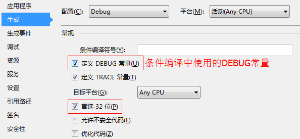 ConditionalAttribute特性下面是ConditionalAttribute的构造函数: public ConditionalAttribute(string conditionString 构造函数中的参数conditionString,是一个区分大小写的条件编译符号的字符串。 上面提到Debug.WriteLine时,说到这个功能只在Debug模式下才有用,Release下就不起作用了。 我们从MSDN中看一下Debug.WriteLine的说明: [ConditionalAttribute("DEBUG")]public static void WriteLine(string message 由此也就明白了Debug.WriteLine只能在Debug模式下使用,而在Release模式下无效的原因了。 条件编译#if..#else..#endifC/C++中有#if..#else..#endif,C#中也有这些,他们都被称为预处理器。通过预定义的条件编译符号,来控制编译时编译哪部分代码。如下: public bool HasPermission(string userName) { #if DEBUG //Debug模式下,不需要做权限判断,直接返回true return true; #else //Release模式下,只有sa用户才有权限 if (!string.IsNullOrEmpty(userName) && userName == "sa") { return true; } else { return false; } #endif } 预定义的Debug宏在什么地方说到条件编译,是不是只有DEBUG 和 RELEASE两种情况呢,如果是这种情况的话,那也就是说DEBUG和RELEASE两种情况是定义好了的,俗话说就是“做死了”,这是作死的节奏啊。不作死就不会死,至少VS在这点上还没有作死。 让我们来一步步揭开DEBUG的面纱。 既然是条件编译,那么就应该和编译选项有关。我们知道C#项目,有一个属性页,可以设置很多编译的选项,如下: 从图中看到,条件编译是用的DEBUG常量,或者称为DEBUG条件编译符号,是在这个编译生成选项中定义的,如果去掉这个定义,那么编译后的HasPermission方法就会根据用户名进行权限检查,程序中通过Debug.WriteLine输出的调试信息也会输出到DebugView中,也就相当于Release模式下的效果。 其实DEBUG常量与Debug、Release模式并无太大的关系,唯一的关系就是,VS生成的项目中,Debug模式下,默认会选中“定义DEBUG常量”,而Release模式下,默认不会选中。也就是说,Debug模式,默认会定义DEBUG常量,而Release不会,如下图: 既然DEBUG常量与Debug模式无本质上的关联,那么为什么说到Debug,就认为DEBUG呢。道理其实很简单,世上本无路,走的人多了,便成了路。本来这个DEBUG常量只是Debug模式下的默认预定义的常量,只是因为大家习惯了,并且对它的这种预定义还比较认可,时间久了,就自然而然认为DEBUG就代表Debug模式。 虽然我们可以通过去掉DEBUG常量,来使条件编译在Debug模式下达到Release模式的效果,但是建议最好不要这样做,因为这就像是大家普遍都认可的一个约定,如果你一反常态,不遵守这个约定,对于程序,编译没有问题,但是后续维护肯定会相当麻烦,所以还请大侠手下留情。 使用自定义的编译常量DEBUG常量作为一种普遍的约定,最好不要打破。如果有除DEBUG外的条件编译需要,可以使用自定义的编译常量。 自定义编译常量有两种方法: