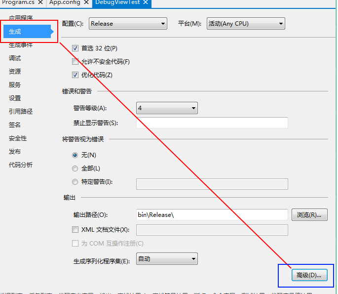 接下来,我们详细的看一下。 常量定义不同这个相信大家已经非常清楚了,Debug模式下会定义DEBUG、TRACE常量,而Release模式下只定义TRACE常量,如下图所示 优化代码不同Debug模式下,默认不会进行代码的优化,而Release模式下,由于默认选中了“优化代码”选项,所以编译器会对生成的代码进行优化,以提高运行速度。 包含的调试信息不同编译生成的属性页中有一个“高级”按钮,点击后会弹出一个对话框,然后可以对编译生成进行一些设置,如下 Debug与Release的高级选项对比: 从图中看到,Debug模式下默认会生成全部的调试信息,而Release模式下只生成pdb文件。 输出路径不同这一点详细大家都很清楚了,Debug模式下会输出到Debug目录,Release模式下会输出到Release目录,如图: Debug编译与Release编译的区别总结说了这么多,我们再来思考本节开始时说到的关于Debug编译与Release编译的区别的答案,可以得出这样的结论: