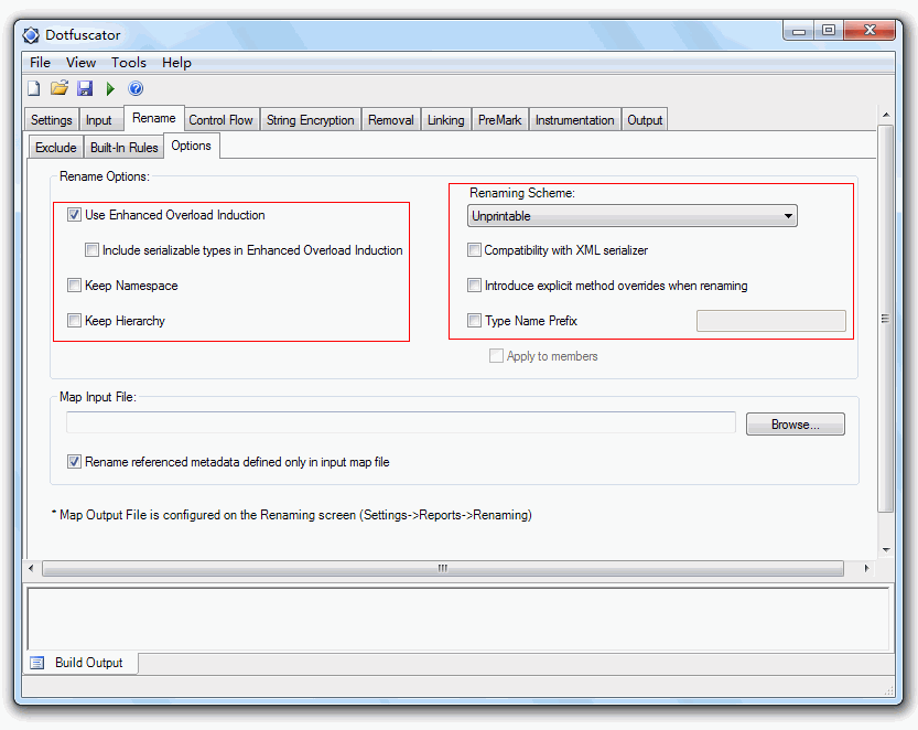 Rename 选项 勾选“use enhanced overload induction”(使用增强模式),注意:不要勾选下方的“ Do not suppress on serializable types”,即序列化类型的变量不加密,否则编译后可能异常; “Renaming Scheme” 选择“Unprintable”(不可打印字符,即乱码),也可以选择其他如小写字母、大写字符、数字的方式,如下图: