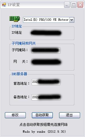 namespace IPSet { public partial class FrmIPset : Form { public FrmIPset() { InitializeComponent(); // 获取本地计算机所有网卡信息 string carName = ""; ManagementObjectSearcher search = new ManagementObjectSearcher("SELECT * FROM Win32_NetWorkAdapterConfiguration"); foreach (ManagementObject sear in search.Get()) { if (sear["IPAddress"] != null) { carName = sear["Description"].ToString().Trim(); comboBox1.Items.Add(carName); } } comboBox1.SelectedIndex = 0; } private void button1_Click(object sender, EventArgs e) { ManagementClass mc = new ManagementClass("Win32_NetworkAdapterConfiguration"); ManagementObjectCollection moc = mc.GetInstances(); foreach (ManagementObject mo in moc) { if ((bool)mo["IPEnabled"]) { if (mo["Description"].ToString() == comboBox1.SelectedItem.ToString().Trim()) { ManagementBaseObject newIP =mo.GetMethodParameters("EnableStatic"); ManagementBaseObject newGateway =mo.GetMethodParameters("SetGateways"); ManagementBaseObject newDNS =mo.GetMethodParameters("SetDNSServerSearchOrder"); // 将要修改的目标 IP 地址 // string selectNewIP; string IPStr = ""; string[] IPPart = maskedTextBox1.Text.Split('.'); for (int i = 0; i <= 3;i++ ) { //删除尾部首部的空格 IPStr+=(IPPart[i].Trim()+"."); } IPStr = IPStr.Substring(0,IPStr.Length-1); newIP["IPAddress"] = new string[] { IPStr };