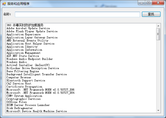 C#使用ServiceController控制类Windows服务,添加首次使用前引文:System.ServiceProcess,空间中引用:using System.ServiceProcess。 以下示例获取本机已安装的Windows服务和应用,然后查找某一应用活服务是否已经安装。 代码: using System; using System.Collections.Generic; using System.ComponentModel; using System.Data; using System.Drawing; using System.Linq; using System.Text; using System.Windows.Forms; using System.ServiceProcess; namespace 判断机器中是否安装了某项服务或者应用 {