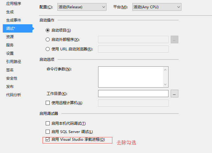 去掉启用调试器下的 启用Visual Studio承载进程勾选: