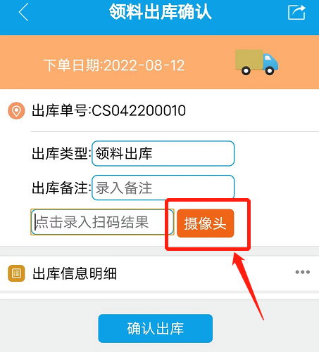 进入后,点击摄像头扫描物料标签上的二维码。(如果有扫码枪直接用扫码枪的快捷扫码按键更便捷。)
