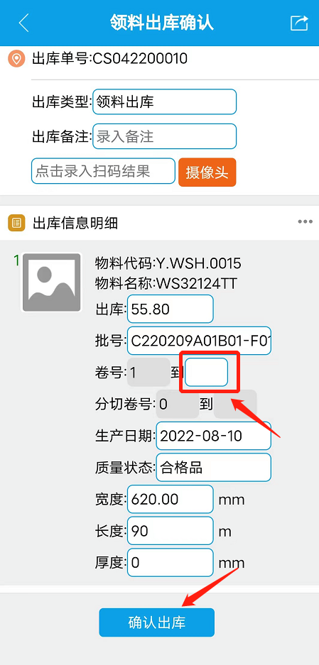 扫描后会有该物料的信息,如果出的是同一批连续卷号的物料,在卷号处填上要出的最大卷号,最后点击确认出库。