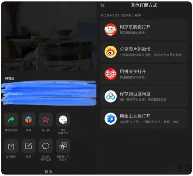 除了开发平台外,近期有用户反馈,只需长按聊天窗口中的图片就会出现新增的“更多打开方式”选项,点击后即可通过不同的小程序打开图片,不过暂时仅支持用户已经使用过的小程序。比如在拼多多、京东等电商平台里搜索图片里的同款商品,在微博发送相应的图片内容等。