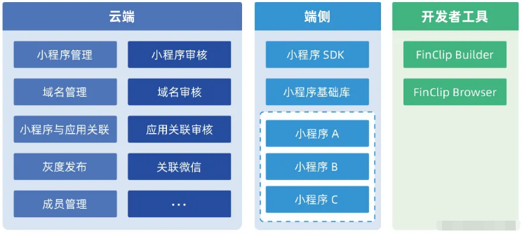 FinClip 分别由 云侧端侧 与 开发者工具 三部分组成: