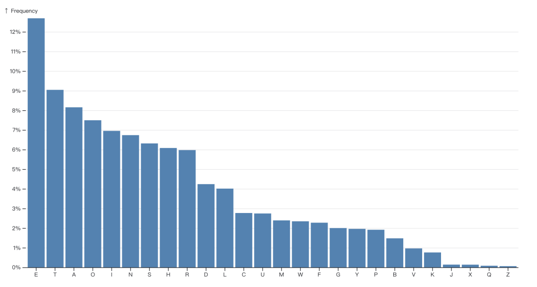 chart = BarChart(alphabet, { x : d => d.letter, y : d => d.frequency, xDomain : d3.groupSort(alphabet, ([d]) => -d.frequency, d => d.letter), // sort by descending frequency yFormat : "%" , yLabel : "↑ Frequency" , width, height : 500 , color : "steelblue" })