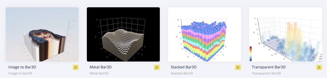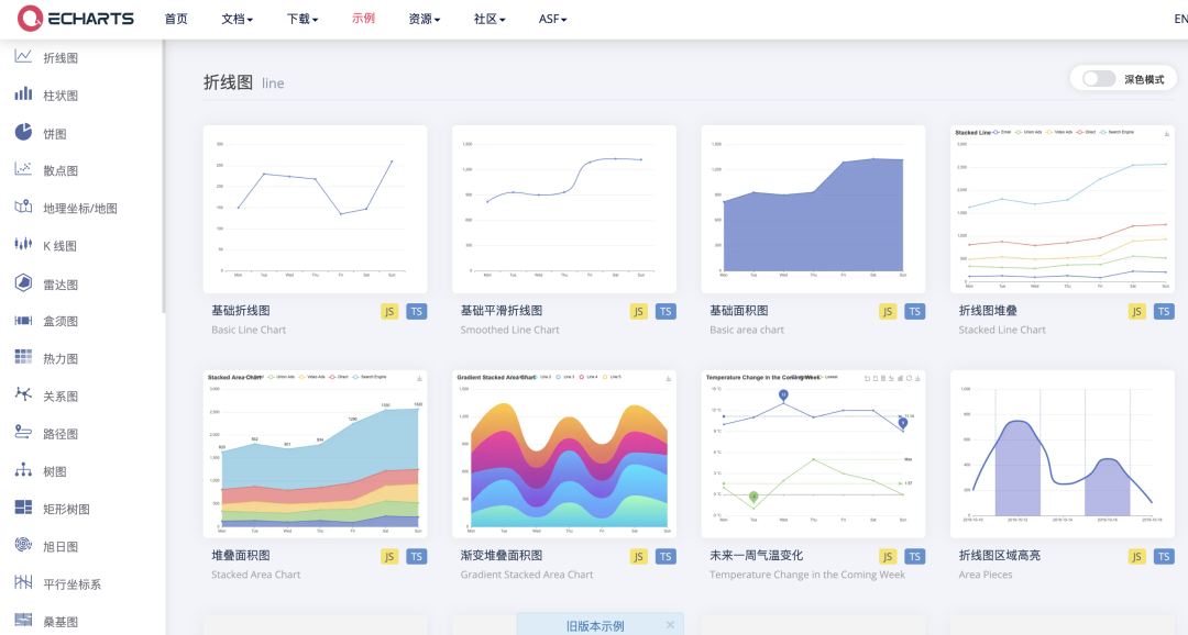 的开源可视化图表库, 内置了非常多的可视化图表库, 包括常用的柱图, 饼图, 折线图等, 还有非常多的3D组件, 如下: github地址 : https://github.com/apache/echarts