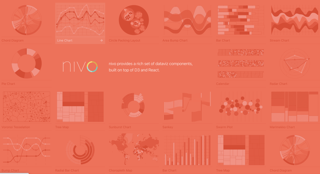 的精美的可视化图表框架,提供十四种不同类型的组件来呈现图表数据。 Nivo