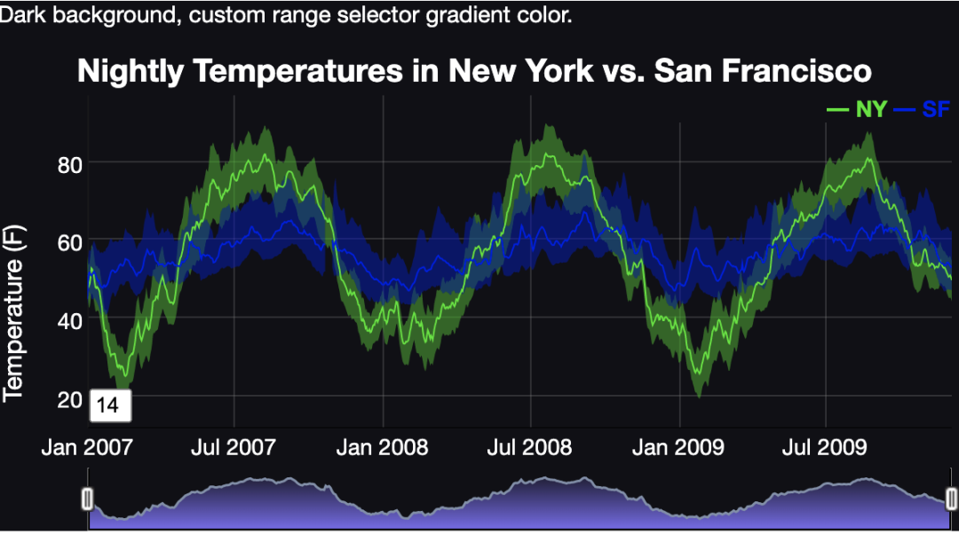 可配置且非常有意思。这是一个高级库,使用非常便捷。接下来分享几个图表案例: