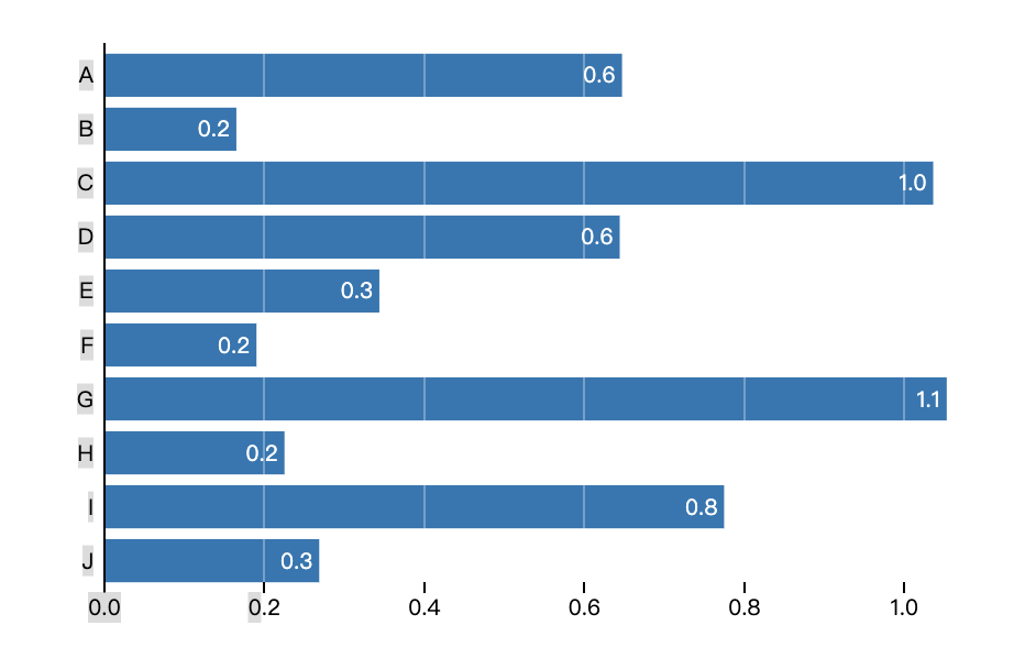 /* Sizing and scales. */ var w = 400 , h = 250 , x = pv.Scale.linear(0 , 1.1 ).range(0 , w), y = pv.Scale.ordinal(pv.range(10 )).splitBanded(0 , h, 4 /5 );/* The root panel. */ var vis = new pv.Panel() .width(w) .height(h) .bottom(20 ) .left(20 ) .right(10 ) .top(5 );/* The bars. */ var bar = vis.add(pv.Bar) .data(data) .top(function () y (this.index )) .height (y.range( ).band ) .left (0 ) .width (x ); /* The value label . */bar .anchor ("right" ).add (pv.Label ) .textStyle ("white" ) .text (function(d ) d .toFixed (1 )); /* The variable label . */bar .anchor ("left" ).add (pv.Label ) .textMargin (5 ) .textAlign ("right" ) .text (function( ) "ABCDEFGHIJK ".charAt (this.index )); /* X -axis ticks . */vis .add (pv.Rule ) .data (x.ticks(5 )) .left (x ) .strokeStyle (function(d ) d ? "rgba (255 ,255 ,255 ,.3 )" : "#000") .add (pv.Rule ) .bottom (0 ) .height (5 ) .strokeStyle ("#000" ) .anchor ("bottom" ).add (pv.Label ) .text (x.tickFormat );vis .render ();