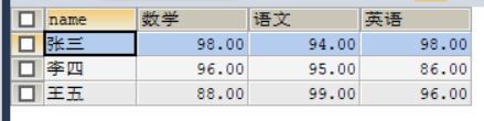 select NAME,SUM(CASE WHEN km='数学' THEN score END) AS '数学',SUM(CASE WHEN km='语文' THEN score END) AS '语文',SUM(CASE WHEN km='英语' THEN score END) AS '英语' from student GROUP BY NAME