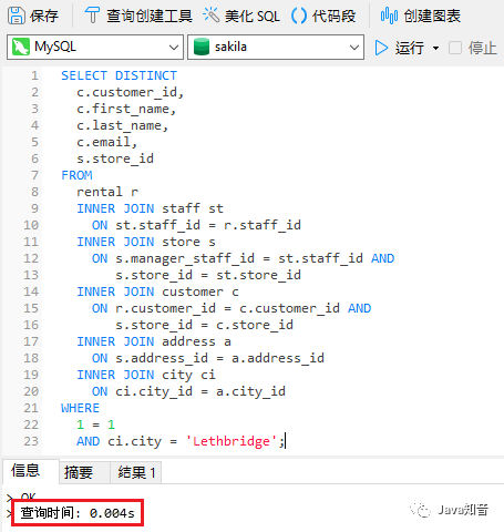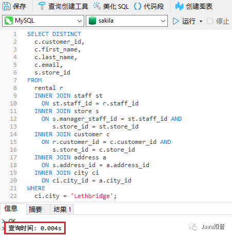 首先,以下是在 Sakila 示例数据库运行的查询,获取从 Lethbridge 商店租借电影的客户:
