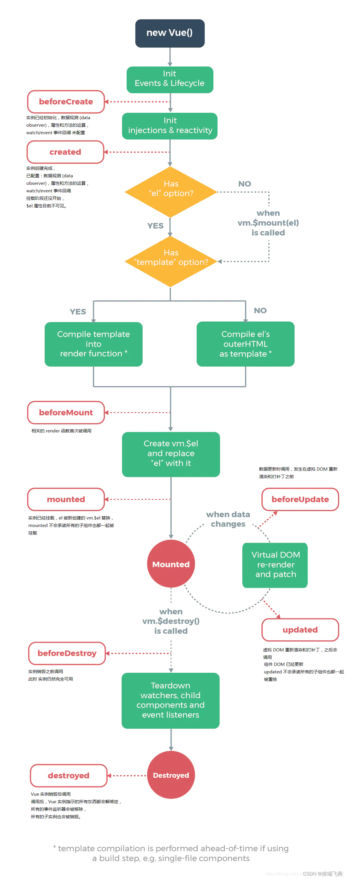 4.生命周期最后,每个Vue组件都有生命周期,过程为创建 -> 挂载 -> 更新 -> 销毁。开发者可以通过钩子函数(如mounted)在组件生命周期中的不同时刻进行操作。下面是一张Vue生命周期的完整图解。