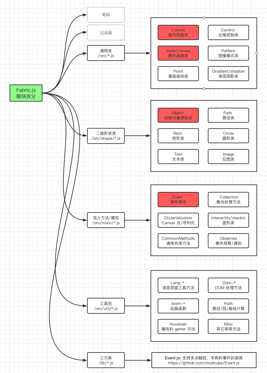 上图中,灰色的模块对于理解 fabric.js 核心工作原理没多大作用,可以不看。其它核心模块我按自己的理解来解释一下。