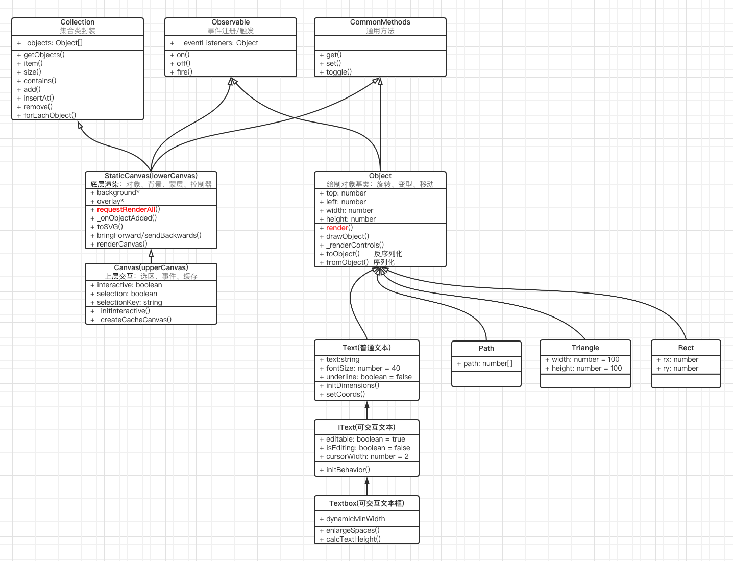 上层画布类,如上面表格所述,它并不渲染对象。它只来处理与用户交互的逻辑。 比如:全局事件绑定、快捷键、鼠标样式、处理多(分组)选择逻辑。